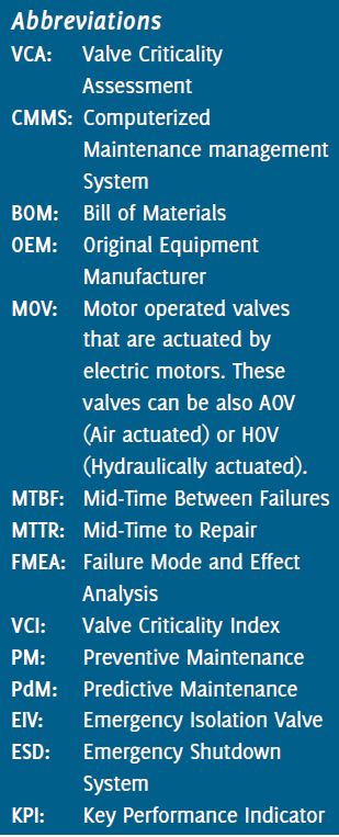 After VCA is conducted, each operating facility through Maintenance must review all valves on the computerized maintenance management system (CMMS) as per above list of critical valves (those with VCI within 0 and 3) and ensure they are assigned with a Criticality Class “A”. In parallel, the assigned BOM structure for each valve must be reviewed and created/completed (In case it does not exist) including the segregation of all those spare parts considered obsolete and no longer supplied by the valve OEM.