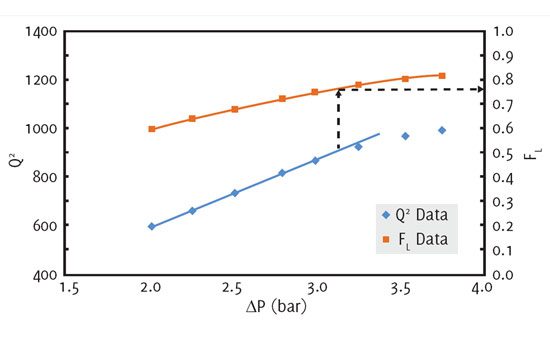 It is then a case of plotting the data and identifying when the flow starts to choke, and the corresponding FL number at this point. If there is little to no cavitation in the valve, the flow rate squared (Q2) versus the differential pressure (ΔP) should be a linear relationship. Any deviation indicates the formation of vapour, the flow is becoming choked, and the cavitation intensity is increasing, (see figure top right, the dotted arrows indicate the point at which this linear relationship starts to break down).