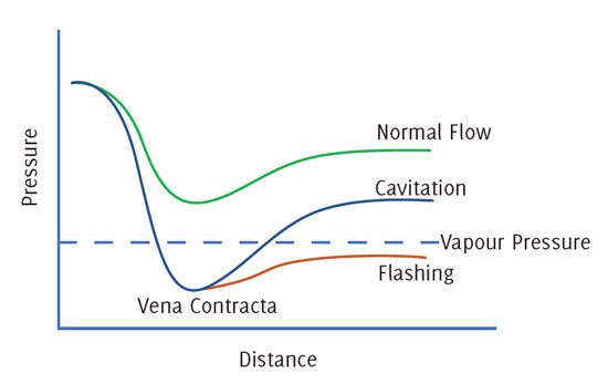 Cavitation occurs when the pressure drops below the vapour pressure of the fluid but then recovers above the vapour pressure as it exits the valve. This pressure recovery results in the collapse or implosion of vapour bubbles that have formed, leading to significant noise emission and erosion of the valve trim.