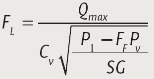 Where Qmax is the flow rate at choked conditions, P1 is the inlet pressure, PV is the vapour pressure, SG is the specific gravity, CV is the flow coefficient, and FF is the liquid critical pressure ratio factor.