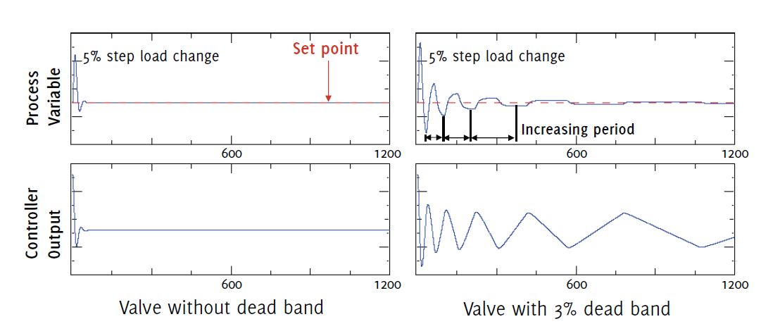 Figure 4 demonstrates the effect of dead band on process control. Both pairs of graphs represent the response to a 5% step change in load. The pair of graphs on the left is a process where the valve has zero dead band, and the pair of graphs on the right represent a process where the valve has a dead band of 3%. In both cases, the controller is tuned for fast but robust response to load changes.