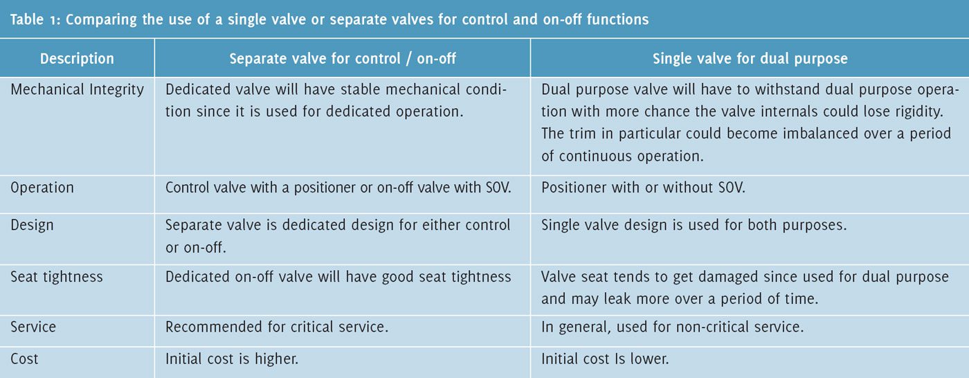New plant is designed considering as throttling and on-off service separately and never consid-ered as single valve for both purposes. Be that as it may, it is interesting to list and compare the pros and cons of using a separate valve for control and on-off function or to use a single valve for both duties. Please see Table 1.