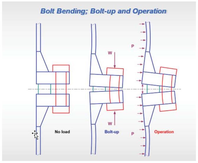 Regardless of the magnitude, there will always be some degree of bolt bending due to flange rotation. This bending increases the tensile stress on one side of the bolt while decreasing it on the opposite side. The added stress on the tensile side of the bolt should be considered when evaluating the stress limit on the bolting material. Figure 2 illustrates the typical effects of bolt-up and operation on bolt bending.