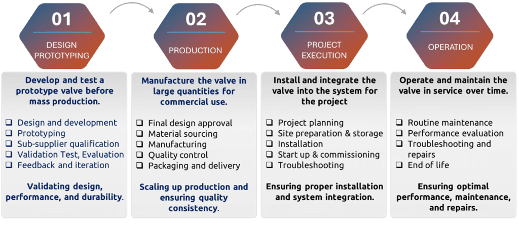 The production phase focuses on the large-scale manufacturing of valves for commercial deployment. Activities encompass final design approval, material sourcing in accordance with specifications, manufacturing, quality assurance procedures and packaging